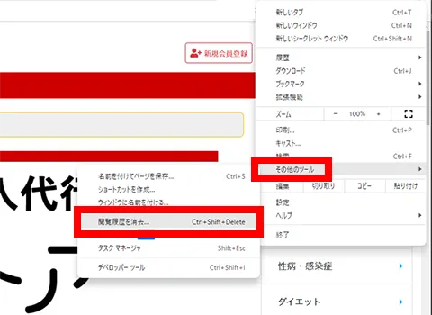 「その他のツール」の中の「閲覧履歴を消去…」をクリックします。