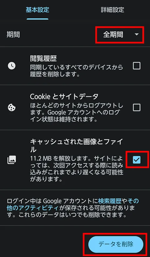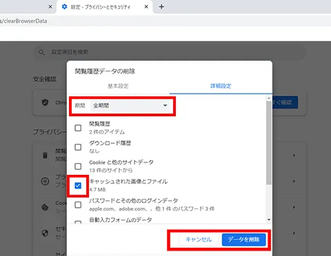 - 「キャッシュされた画像とファイル」のみにチェックします。