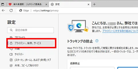 左メニュー「プライバシー、検索、サービス」をクリックします。