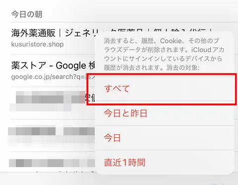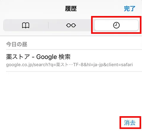 履歴ボタン(時計のアイコン)をタップしてから右下の「消去」をタップします。