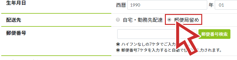 商品配達先はご注文時に『自宅』もしくは『郵便局留』に指定することができます。