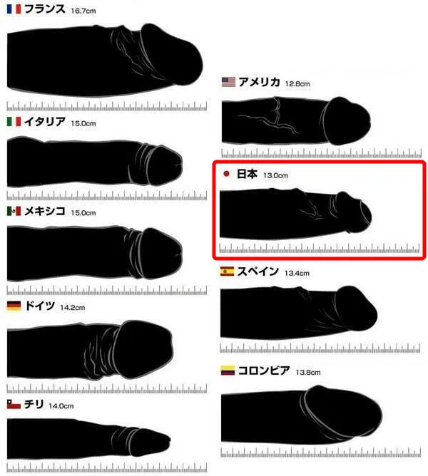 この図だけを見ると1位はフランスのように思えますが、実はアフリカにはさらにペニスサイズが大きな国や地域がいくつもあり、日本は全世界でトップ10入りしているわけではありませんのでご注意ください。