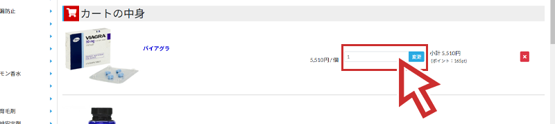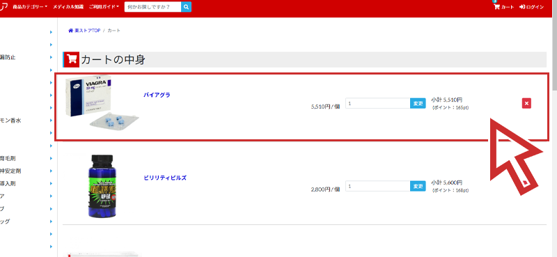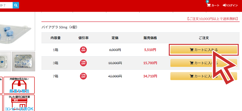 商品ページのカートに入れるボタンをクリックします(用量等お間違えの無いようご注意ください)。